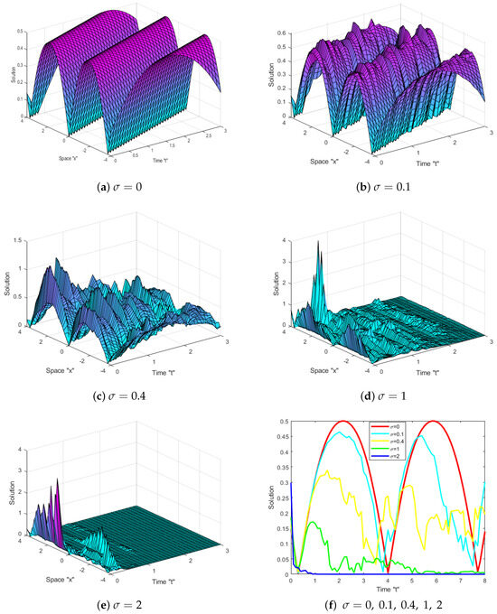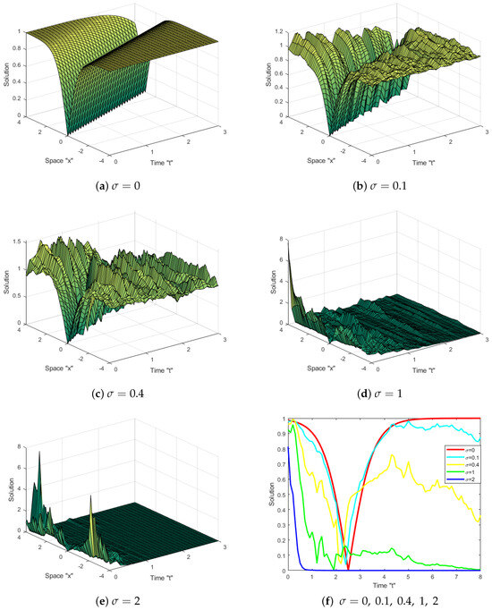 We now look at the influence of the multiplicative Wiener process on the exact solutions of the SHFE (1). Several numerical simulations of different solutions with various amounts of noise are provided by using Matlab. Figure 1 and Figure 2 show the solutions specified in Equations (42) and (55) for distinct values of as follows: