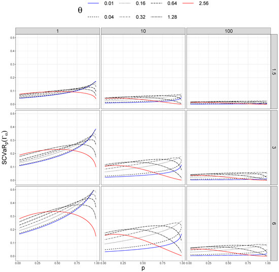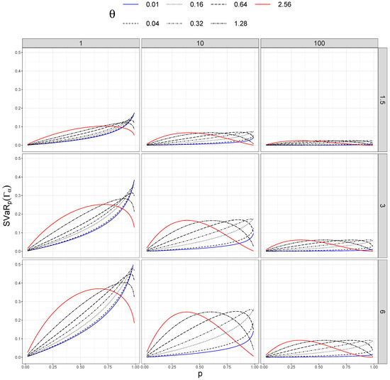 Then, we fixed , and considered three representative values of , , and samples of size . For all the combinations of these hyperparameters, 100,000 values of the random variable were generated. We conducted 100 replications, in order to determine the sensitivity measures for VaR and CVaR, taking the mean of each measure.