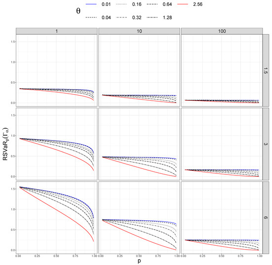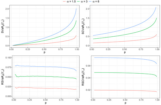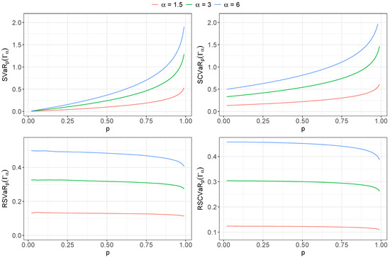 We can notice the interaction between the values of and p in Figure 2 and Figure 3. For the different values of the shape parameter , we can see the different behaviors of the variations in the sensitivity measures when the values of p change.