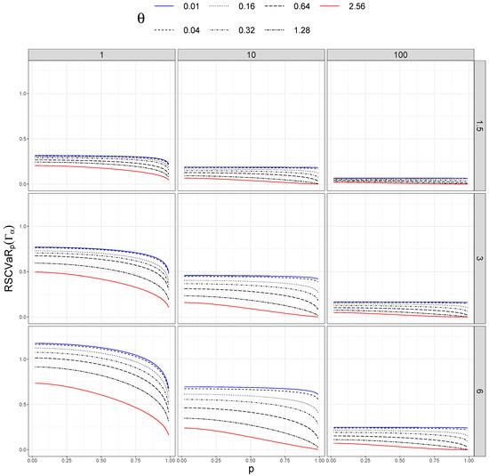Then, we set , fixed , and took a prior distribution for the parameter . To determine the sensitivity measures for VaR and CVaR, we generated 100,000 values of the random variable , taking the mean of each measure. Figure 6 shows the sensitivity measures (upper charts) and relative sensitivity (lower charts) measures of VaR and CVaR for different values of p.