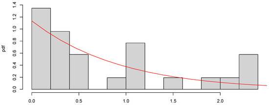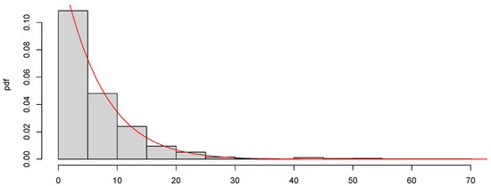 The values that exceed the 0.9 order quantile are considered extreme values and relocated. The resulting dataset is small, with 26 values. We can see the histogram of the dataset values on Figure 5, fitted to a GPD (0.06, 15.46). The estimations for and were computed using the function gpd from evir library [41] of R.