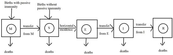 Mathematical models of this type of phenomenon clarify which are the important parameters to take into account to obtain concepts such as thresholds, basic reproduction numbers, number of contacts and replacement numbers. This in turn allows us to make computer simulations. Having the information provided by epidemiological models helps to know what data must be collected in an epidemic, identify trends, make estimates and calculate uncertainties in these estimates. Later, in 1926, models were formulated from which thresholds could be calculated or an epidemic outbreak appears and this happens when the number of susceptible reaches a critical value [8,11,12]. The model presented in [12] is a reference in the modeling with non-linear dynamic systems of the phenomenon of virus propagation in networks. This type of model is known as composed by compartments since it conceives the states through which an individual passes during an epidemic as boxes or compartments. The compartments are labeled by the letters and S that cover the different characteristics that one may have, such as having generated antibodies from the mother’s womb by maternal transmission, being susceptible, being exposed, being infected and having recovered from the disease, respectively. It is entered vertically either to the state M or to the state S and it is exited vertically when passing to a state of death. There are horizontal transfers between state M to S, from S to E, from E to I and from I to R as it is shown in Figure 1. Some of these compartments will be present in a specific model and others will not be, depending on the particular characteristics of the disease to be modeled. For instance, if the disease to be modeled produces permanent immunity, does not have a passive immunity transmitted by the mother and there is no incubation period, then the compartments that will be present are R (Susceptible, Infected and Recovered) and will be called a -model.