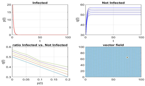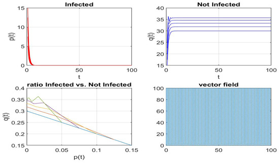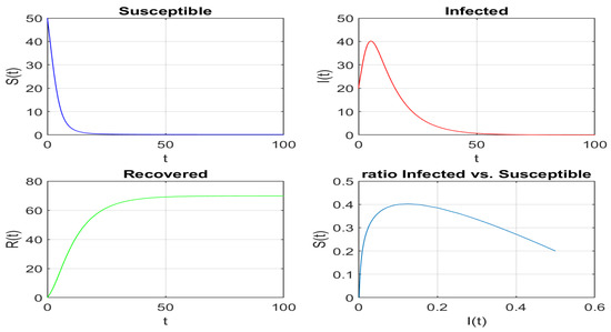 In reference to Figure 2, as can be seen in the graphs generated by the simulation of the classical epidemic SIR model, the behavior in time of the infected curve reaches its peak or acme and then decreases until it is extinguished as expected since the type of epidemic processes that the model describes is related to infections that produce permanent immunity, which is also observed in the corresponding growth in behavior over time of the recovered curve. It is also important to note that the curve of the proportion of Infected vs. Susceptibles converges to a fixed point in the coordinates , that is, the origin of said coordinate system. It is important to mention that in Figure 2 even though it seems equal to zero.