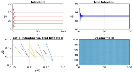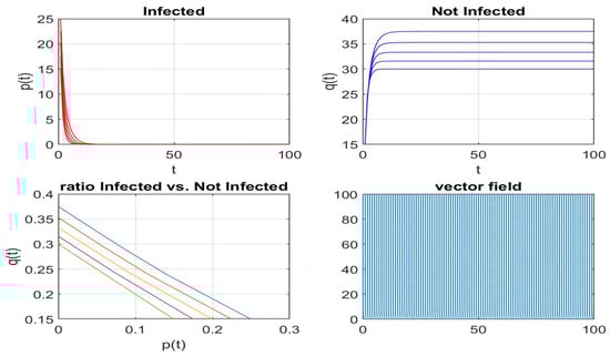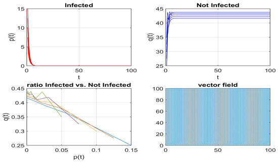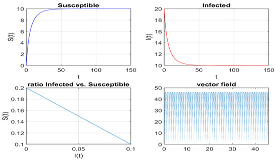 In reference to Figure 3, as can be seen in the graphs generated by the simulation of the classical epidemic SIS model, the number of infected decreases until it converges to some given level and simultaneously the number of susceptible grows until some level and stays there as expected, since the type of epidemic processes that the model describes is related to infections that produce temporary immunity. It is also important to note that the curve of the proportion of Infected vs. Susceptible converges to a fixed point in the coordinates .