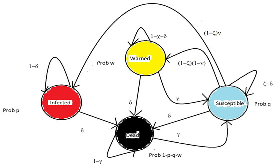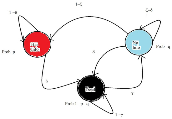 In order to understand the spread of viruses on a network, the model proposed in [22] assumes that the nodes behave according to a SIS-type model and that they are interconnected by a network. They also assume that we take very small discrete timesteps of size where . The survivability results in [22] apply equally well to continuous systems. Within a time interval, each node i has probability of trying to broadcast its information every time step, and each link has a probability of being up, and thus correctly propagating the information to node j. Each node i also has a node failure probability . Every dead node j has a rate of returning to the up state, but without any information in its memory. Another important parameter of the Chakrabarti model is which represents the probability that node i is alive at time t and has info, that is, the node is infected, that represents the probability that node i is alive at time t and has no info, that is, the node is not infected and that represents the probability that node i does not receive info from any of its neighbors at time t. The details about the parameters of this model as well as the fast extinction conditions and stability results can be consulted in [22]. the authors of [22] chose to use the non-linear dynamic systems approach and fixed point theorems. The state transitions at each node are shown in Figure 8.