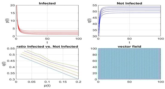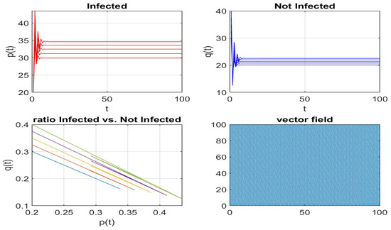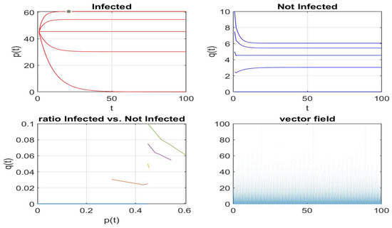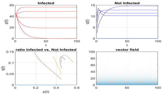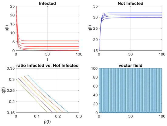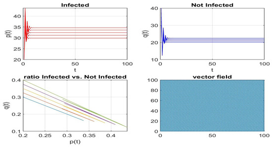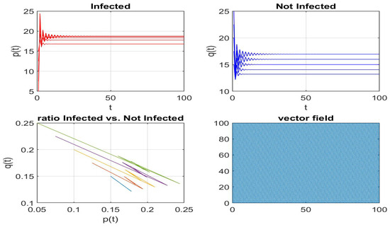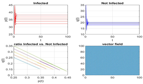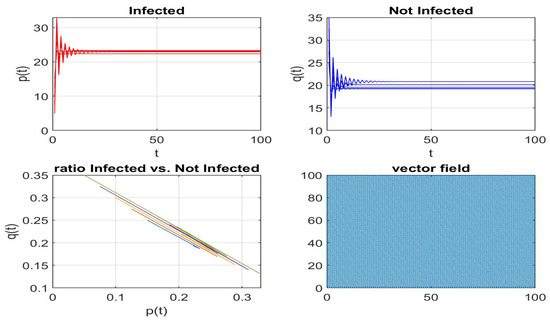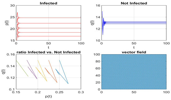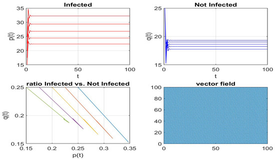 Figure 14 shows the behavior of the SIRS model in a power law-type network from five different initial conditions that consist of varying and in increments of . Each process converges to states where the number of infected is higher than the number of susceptible.
