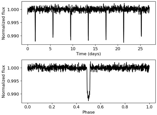Figure 4. As shown, the transit of the phase-folded light curve is composed of much more points, thus allowing for better checking the Mandel and Agol theoretical shape. Both views of the light curve were simulated, taking into account the main parameters from TIC 183537452 (TOI-192), except the epoch and the temporal span of the light curve, which were not considered as they do not condition the noise levels and the transit shape. TOI-192 is part of the TOI Catalog, short for the TESS Objects of Interest Catalog, which comprises a compilation of the most favorable targets for detecting exoplanets. Its complete and phase-folded light curves are shown in