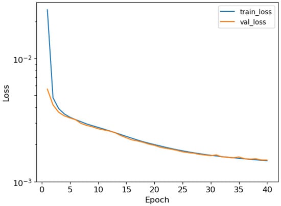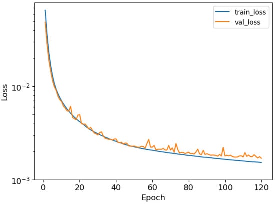 Figure 9 show, respectively, the training history of models 1 and 2 in a logarithmic scale. As shown, the training process was completed correctly, as the validation loss decreased along with the training loss among the epochs.