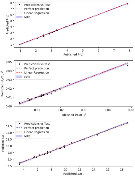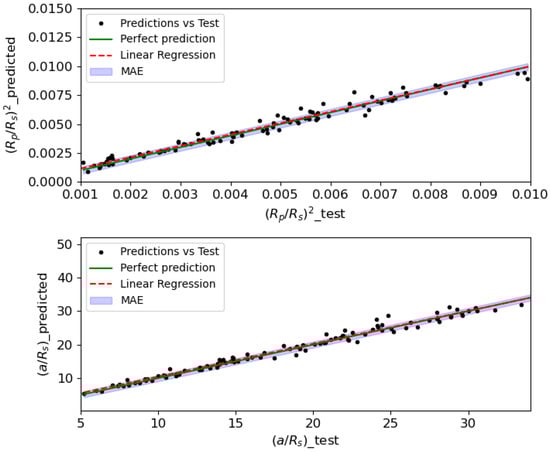 Figure 14, the comparison between real data and predicted values is plotted to check the accuracy of the predictions visually. The differences between the results obtained with real and simulated data were due to the fact that, although simulating the light curves as most similar as possible to those expected for the TESS mission was attempted, in reality, it is impossible to have them the same. However, these results show that both models are able to characterize transiting exoplanets from the TESS light curves of their host star also in real data, which means that our models were well trained and that the light curve simulator is able to mimic real TESS light curves with high accuracy.