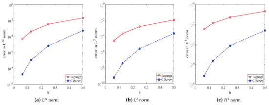To illustrate, mesh size . In Table 1 and Figure 5, it can be observed that the numerical solutions derived by the C-Bézier basis are 2–4 orders of magnitude more accurate than that of the Lagrange basis. This indicates that the C-Bézier finite element method works well for elliptic problems involving Dirichlet boundary conditions applied on edges. Figure 6 shows the norm errors of the Lagrange basis and the C-Bézier basis function with .