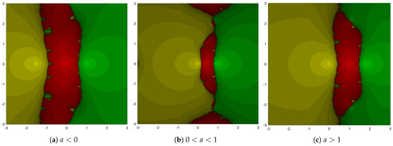 Therefore, the fixed points are attractive. In Figure 4, we plot the basins of attraction [16] of Traub’s method for the cubic polynomial (6) for three values of the parameter a, to the left of zero (), to the right of 1 (), and in between ().
