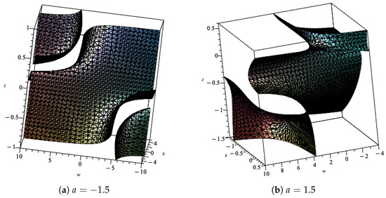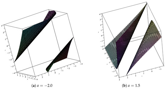 If all three or just one of them is positive, then ; otherwise, . The two planes and and the surface defined by the cubic are the boundaries of the regions. See Figure 9 for the surface defined by the cubic for two different values of the parameter a.