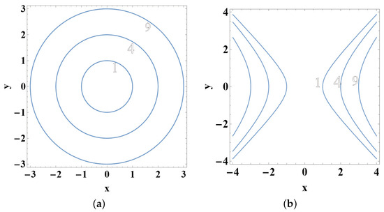 - Case 3. . This choice leads to . If we set , then we obtain and we find the coefficient at last. It is 3. As a conclusion, the potential iswhich produces the monoparametric family of orbits