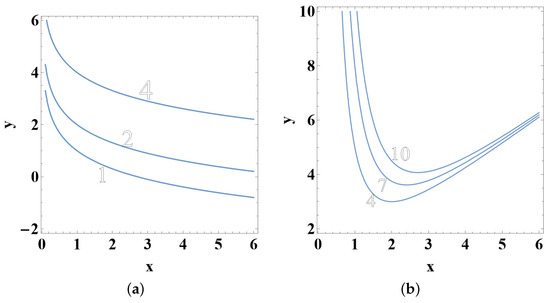 - Case 2. . This choice leads to . If we set , then we obtain and finally we determine the coefficient . It is 3. As a conclusion, the potential takes the formwhich produces the monoparametric family of orbits