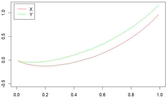 Theorem 1 tells us that we can determine whether or not there is a stochastic dominance relationship between two populations by using the images of the quantile functions and their associated function curves, for example if X has the normal distribution and Y has the normal distribution . We draw the plots of the quantile functions of X and Y in Figure 1 for all . It can be seen from Figure 1 that the plot of the quantile function of Y always lies above that of X. This implies that by Theorem 1 (i). On the other hand, if X has the normal distribution with the quantile function , Y has the normal distribution with the quantile function . We draw the plots of and for all in Figure 2. It is obvious from Figure 2 that the plot of lies above that of for all , which implies by Theorem 1 (ii).