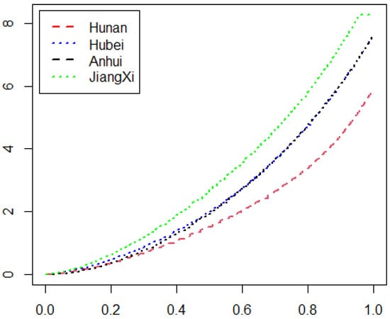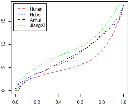 Based on the visibility data of Jiangxi, Anhui, Hubei, and Hunan provinces, if we repeatedly calculate the values of by Equation (1) and draw the plots of for these four provinces in Figure 4, as can be seen, the second-order stochastic dominance relationships between provinces are more significant than the first-order ones. The plot related to Jiangxi province always lies above that of the other three provinces. This indicates the visibility data of Jiangxi province stochastic dominate those of other provinces with the second order. The related curves of Hubei and Anhui are also above Hunan.