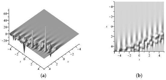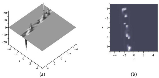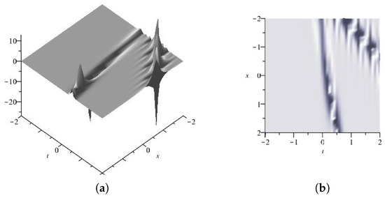 Figure 27. The (a–e) display the 2D, 3D and the contour plots of - Three wave solutions for (5):In a similar way, we getandThus, the three wave solutions can be presented by respectively.