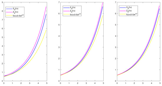 Then, we plot the convergence of the newly constructed confluent Szász–Durrmeyer operators and Durrmeyer-type Szász operators [4] to the function f in Figure 1 for . In Figure 1, we give three different illustrations for selected values , , and , respectively.