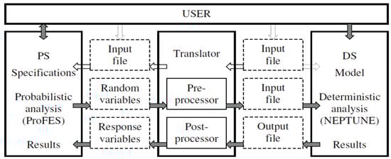 The integration process initiates with the processing (import) of the deterministic model’s input file (from DS) by the translator. A pre-processor is employed to inform the probabilistic software (PS) about the parameters to be used as random variables in the current deterministic model, particularly if the user interacts through the PS’s GUI.