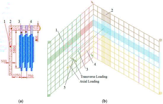 Here, the response variable “y” is incorporated into the limit state condition y > −1.7 × 107. L11-1 is the Load Unit 1-1, and L11-3 is the Load Unit 1-3 (Load Unit 1-1 and Load 1-3 are loading points at different times). P4 is the Poisson’s ratio of wall 2 (Figure 3), Y4 is the Young’s modulus of the concrete of wall 2, re1 is the rebar 1 area of wall 2, re3 is the rebar 3 area of wall 2, re4 is the rebar 4 area of wall 2, r5 is the yield stress of the reinforcement bar in wall 2, Yi7 is the yield Stress of pipe 3, t7 is the thickness of pipe 3, m7 iks the mid-surface radius of pipe 3, Y8 is the Young’s modulus of pipe 4, P8 is the Poisson’s ratio of pipe 4, Yi8 is the yield Stress of pipe 4, and m8 is the mid-surface radius of pipe 4.