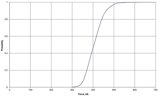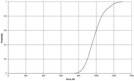 The results of the analysis are depicted in Figure 8, illustrating the relationship between the probability of “Limit State 11” and the applied loads. According to these findings, the ultimate stress (based on Equation (11)) in impacted GDH pipe element 529 reaches a loading of approximately 750 kN (for a demonstration, see Figure 8). The pipe failure probability becomes 1 at a loading of around 1300 kN.
