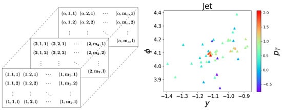 A visualization of graphically structured data (left) and a sample jet shown in the plane (right) with each particle color-coded by its transverse momentum .