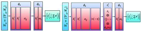 In the layer structure of a GNN, multilayer perceptions (MLPs) are used to update the node features and edge attributes before aggregating, or mean pooling, the updated node features for each graph to make a final prediction. To simplify notation, we omit the graph index , lower the node index i, and introduce a model layer index l. The first MLP is the edge MLP , which, at each layer l, collects the features , its neighbors’ features , and the edge attribute corresponding to the pair. Once the new edge matrix is formed, we sum along the neighbor dimension j to create a new node feature . This extra feature is then added to the original node features before being input into a second node updating MLP to form new node features [8,10,21]. Therefore, a GNN is defined as