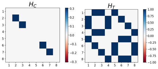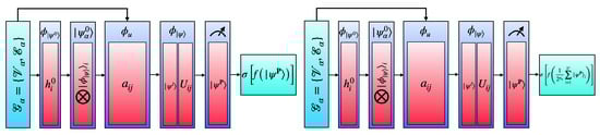 The final product state is measured for output, which is sent to a classical fully connected NN to make a prediction. The analogy between the quantum unitary interaction function and classical edge MLP , as well as between the quantum unitary state update function and classical node update function , should be clear. For a reduction in the coupling Hamiltonian in Equation (7), see Appendix B. The described QGNN architecture is pictorially shown in the left panel in Figure 5.