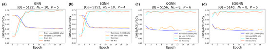 (a) GNN, (b) EGNN, (c) QGNN, and (d) EQGNN training history plots.