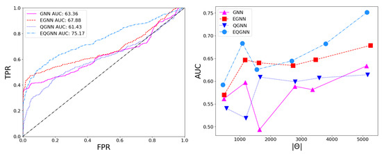 Based on the AUC scores, the EGNN outperformed both the classical and quantum GNN; however, this algorithm was outperformed by EQGNN with a increase in AUC, representing the strength of the EQGNN. Although the GNN outperformed the QGNN in the final parameter test by , the QGNN performed more consistently and outperformed the GNN in the mid-parameter range . Through the variation in the number of parameters, the AUC scores were recorded for each case, where the number of parameters taken for each point corresponded to , as shown in the right panel in Figure 7.