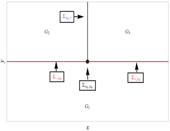 where are smooth scalar functions. For instance, here, we consider . The intersection of the discontinuity boundaries and is the point . The boundaries separate into three regions, , , and , defined as