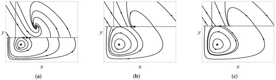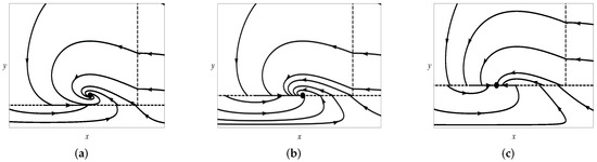 The simulation results are given in Figure 6 when the parameter values are fixed as , , . It is simple to observe from Figure 6 that an admissible focus turns into a pseudonode as varies, while no extra equilibria appear. Therefore, a persistence bifurcation occurs in system (29).