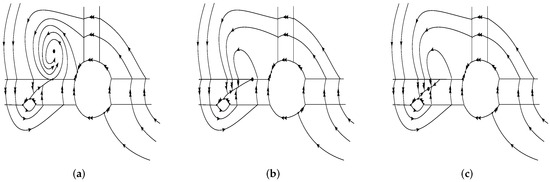 Now, we look at the global dynamics of the regularized system of (39) as the parameter varies. The dynamics of in are defined by the dynamics of in the respective region. In region , there is no equilibrium, and the flow is continuously connected to the flows of and . The flow in region continuously connects to the flows of and . Subsequently, we look at the dynamics in the other regions for the three cases discussed in Proposition 4.