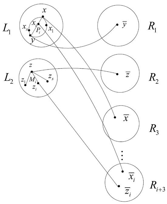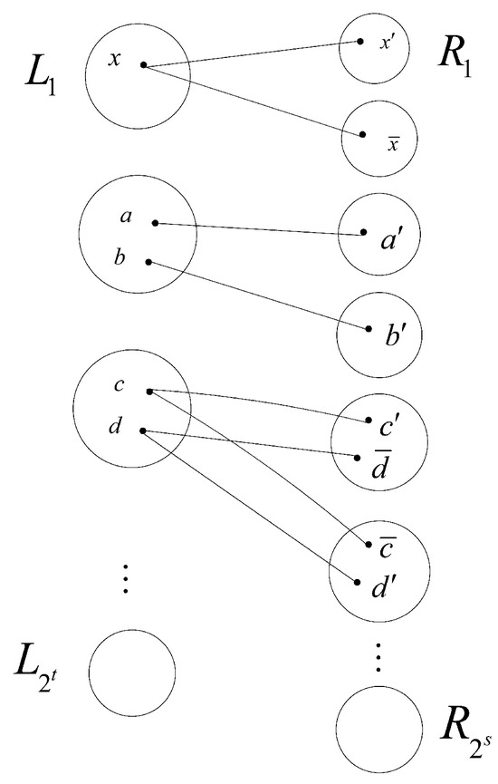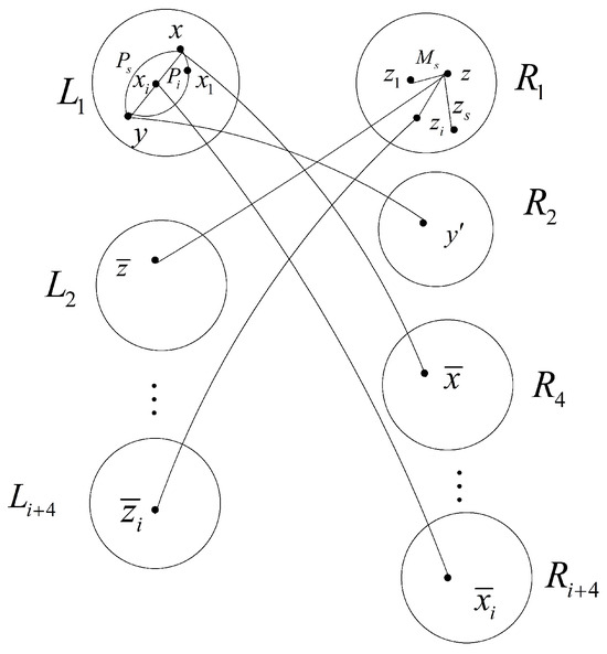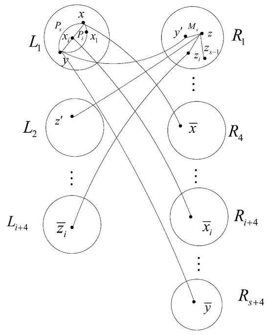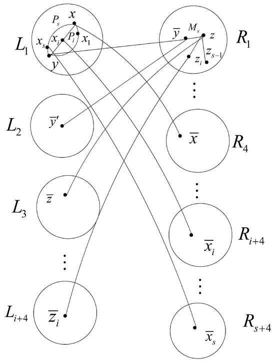 - For each vertex , and belong to distinct and , where . Similarly, for each vertex , and belong to distinct and , where .