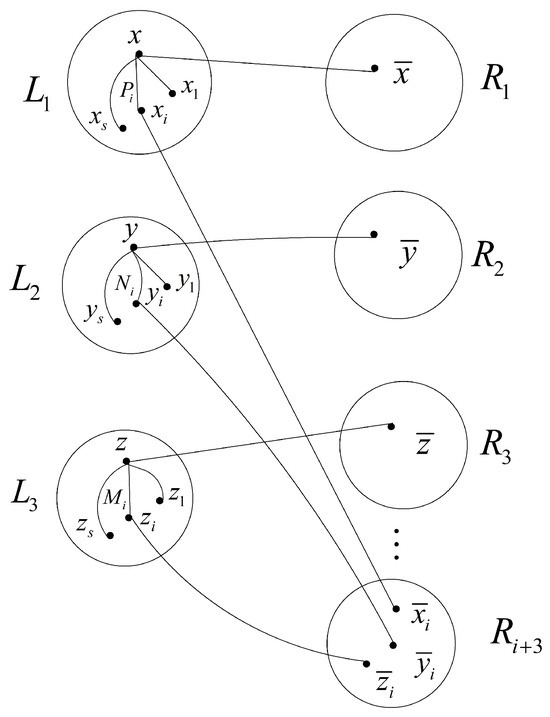 In , each collection of vertices u, with being identical, forms via the edges in . We use to denote these for . Similarly, in , each collection of vertices v, with being identical, forms via the edges in . We use to denote these for .