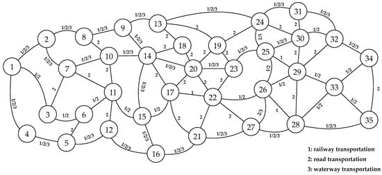 In the optimization model, Equation (1) is the objective function that minimizes the total costs of accomplishing multimodal transportation. The objective function consists of five formulas that successively represent the travel costs, transfer costs, storage costs, penalty costs, and carbon emission costs. Equation (2) is the constraint to the equilibrium of the flow of goods. It ensures that the selected transportation modes on the route are smoothly connected at the nodes to link the origin and destination. Equations (3) and (4) ensure that the goods are unsplittable in the travel process and transfer process of multimodal transportation. Equations (5) and (6) ensure that the travel process and transfer process are connected smoothly at the transfer nodes on the planned route; that is, when the goods arrive at a transfer node by a transportation mode, they will be transferred from this mode to another one at the node, and vice versa. Equations (7) and (8) use the continuous piecewise linear function to calculate the storage and penalty periods caused by the early and delayed delivery of the goods at the destination. Equations (9) and (10) are the capacity constraints to ensure that the volume of goods does not exceed the travel capacity of the selected transportation mode and the transfer capacity between the two selected transportation modes at the selected node on the planned route. Equations (11)–(14) are the constraints of the variable domain.
