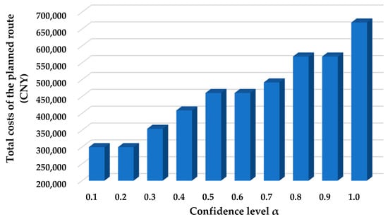 In this study, the confidence level reflects the customer’s preference for the reliability of transportation. To analyze the influence of the confidence level on the optimization results, we took 0.1 as the step and calculated the total costs of the planned routes under different confidence levels from 0.1 to 1.0. The results of this sensitivity are indicated in Figure 2.