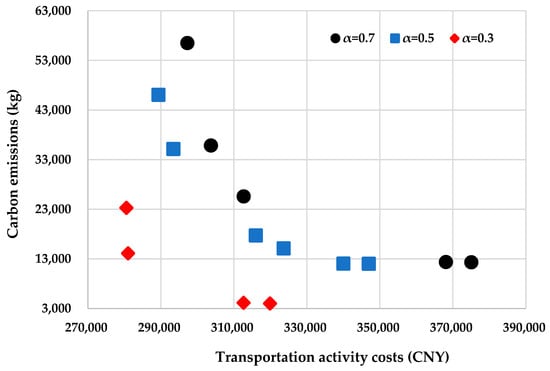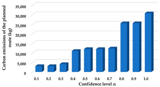 As indicated in Figure 3, the carbon emissions of the planned route increase with the improvement of the confidence level in a stepwise manner. Therefore, the reliability and environmental sustainability of the route are also in conflict with each other. The increase in carbon emissions is an important reason that leads to the increase in the total costs of the planned route.