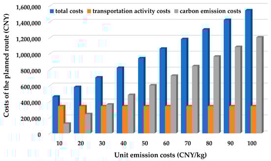 Figure 4 clarifies that the transportation activity costs remain the same since the planned route is unchanged. The increase in the total costs only results from the increase in the unit carbon emission costs. Therefore, charging carbon emissions does not contribute to emission reduction. Under this condition, the emission reduction method is unfeasible, which verifies that charging carbon emissions does not always work in all cases.