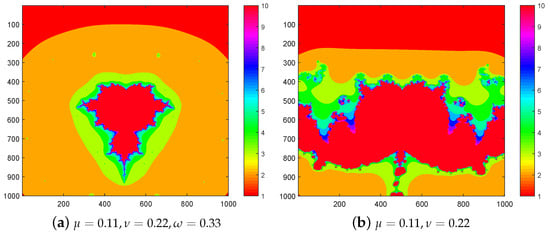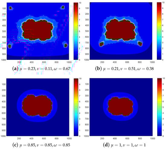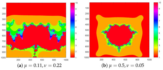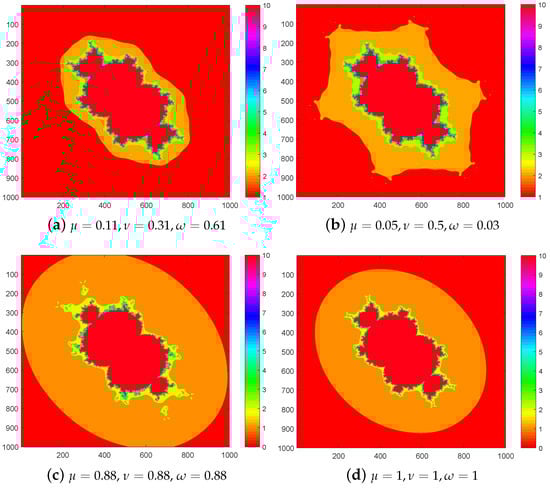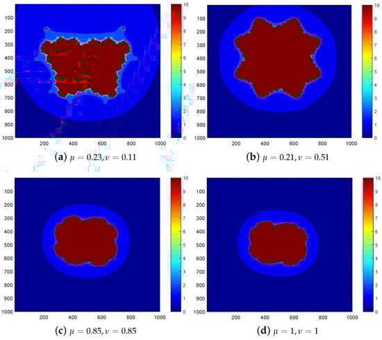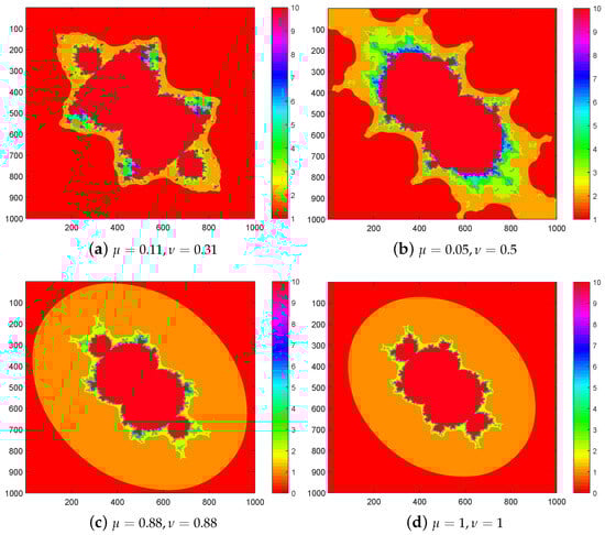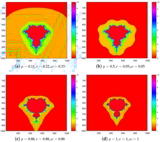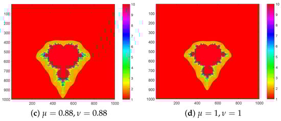 In 2004, Rani and Kumar [17,18] employed the one-step Mann iterative process to create superior and sets for complex polynomials of the degree, characterized by the form . In 2010, Rana et al. [19] and Chauhan et al. [20] expanded on this work by investigating a two-step Ishikawa iteration method to generate comparatively superior and sets. Through this approach, the authors identified unique and sets utilizing the Ishikawa orbit. Following this, in 2014, Rani et al. [21] delved into the three-step Noor iteration process for the construction of and sets. Subsequently, in 2015, Kang et al. [22,23] employed modified Ishikawa processes and S-iteration techniques to explore comparatively superior sets, as well as tricorns and multicorns. Furthermore, in 2016, Kumari et al. [24] uncovered generalizations of and sets applicable to quadratic, cubic, and higher-degree polynomials. They utilized a four-step iterative approach that surpasses the speed of the Picard, Mann, and S-iteration methods. In 2020, Abbas et al. [25] employed a three-step iterative process to produce and sets for complex polynomials of the degree, characterized by the form . In 2022, Kumari et al. [26] introduced a methodology for visualizing and sets for complex polynomials expressed as ; , where . They also devised a viscosity approximation method to generate biomorphs for any complex function.