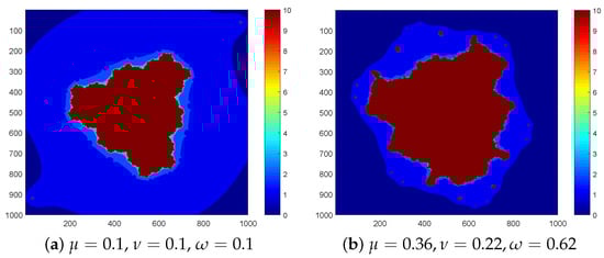 Figure 1. sets of with . - In Figure 2, the polynomial and is considered. We have comparable shapes, but the colors differ significantly. Additionally, Figure 2a,b depict the disconnectivity of orbits of the sets, while Figure 2c,d exhibit connectivity among their orbits.