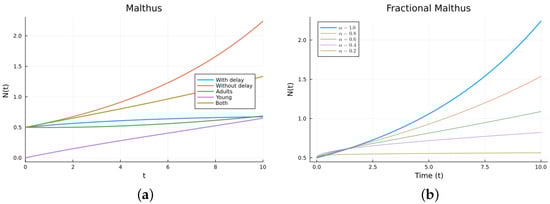 Malthus models. (a) ODE, DDE, and immature population models. The legend “Both” refers to the sum of the mature and immature populations for model (5). (b) Fractional models for several values of .