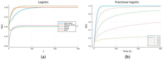 Logistic models. (a) ODE, DDE, and immature population models. The legend “Both” refers to the sum of the mature and the young or immature populations for model (8). (b) Fractional models for several values of .