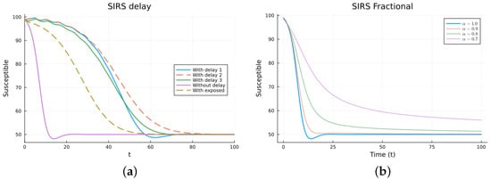 SIRS models, susceptibles. (a) ODE, DDE, and SEIRS models. (b) Fractional models for several values of .