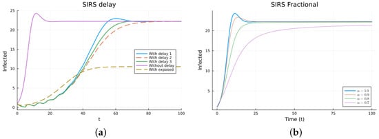 The SIRS model is an epidemic model considering three populations: S(t), I(t), and R(t), satisfying three non-linear equations. The ODE model (11) has two equilibrium points: the disease-free equilibrium (DFE), , with N the total constant population, and the endemic one, [38,64]. The local asymptotic stability of the DFE can be determined by finding the basic reproduction number , which is usually calculated using the next-generation matrix method [53,54]. For , the DFE equilibrium is locally asymptotically stable. The three delay models, Equations (12)–(14), have the same equilibrium points with the same stability, as determined by linearizing about the DFE and analyzing the characteristic equation. The three models make biological sense. Their main difference is when the newly infected stops being counted as susceptible. For some epidemics, the first model may fit the data better than the others, but this may be due to factors not included in the models. For the FDE model, the equilibrium points are the same as for the ODE model. The stability can be analyzed by solving the linearized equation about the DFE, but the expressions for the solutions are not easy to analyze [11,65]. For the SEIRS model (16), the DFE is the same, but the endemic one is different due to the extra compartment, . The DFE is also locally asymptotically stable for , also calculated using the next-generation matrix method. Figure 4 and Figure 5 show the simulations for SIRS models (11)–(14) and (16), as well as (15), using various values of . All the solutions for the integer-order models tend to the same endemic equilibrium point, but the delay and exposed models take more time. The solutions of the fractional models also tend to the same equilibrium. Again, for the fractional model, it can be seen that decreasing slows the solution and that there is a value of that gives a good fit with the delay model solutions, but the fit is not good for small time values. The best value for is between 0.7 and 0.8. The parameter values used are (individual), (1/day), (1/day), (1/day), (day), and (1/day). These parameters are not based on an actual infection. The initial conditions are , which were also used as the history for the delay models, and is additionally used for the SEIRS model.