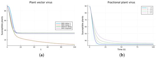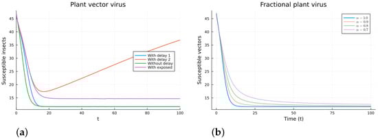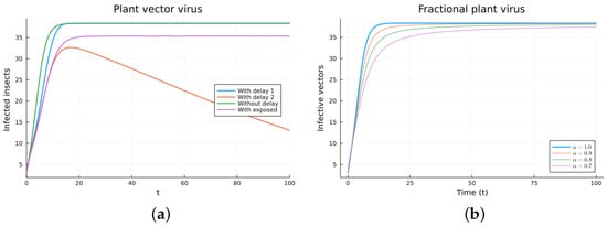 Humans, animals, and plants can all be affected by vector-transmitted viruses. The processes involved are the same. For simplicity, we consider a model for cultivated plants, for which it is reasonable to assume a constant plant population since farmers replace dead plants. Two examples of virus-causing diseases in plants are the cassava virus [48] and the cacao swollen shoot virus [49]. Again, we introduce the delay in different ways to see the differences in the solutions. We consider a simple model with two populations of plants: susceptible (healthy), , and infective (already infected), . Usually, plants do not recover so we do not consider a recovered class. There are also two populations of vectors: susceptible, , and infective, . Vectors are only carriers and do not get the disease so they do not recover. A susceptible plant becomes infected when an infected vector feeds on it, and a susceptible vector becomes infected by feeding on an infected plant. This model is a simplified version of the models presented, for example, in [43,50].