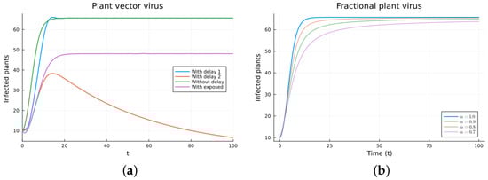 Epidemic models with an exposed class are very common (for plant virus propagation, see, for example, [30,52]). The advantages of using models with exposed populations are that they are based on ODEs, so they only require the initial condition at the initial time, and, as with all epidemic models based on ODEs, the local asymptotic stability at the beginning of the epidemic can be determined using the next-generation matrix method [53,54]. But, from a biological point of view, there is the complication that an individual only stays in the exposed state for a time equal to the delay, whereas some individuals may stay in this state for a much longer time.