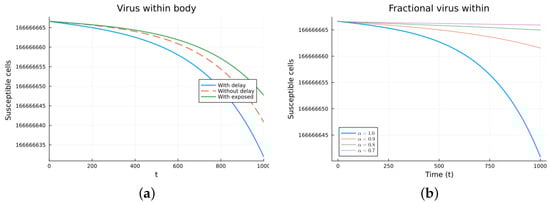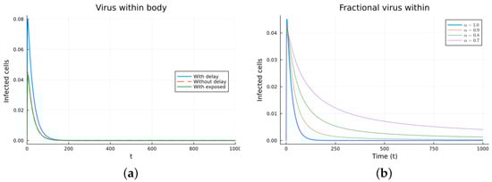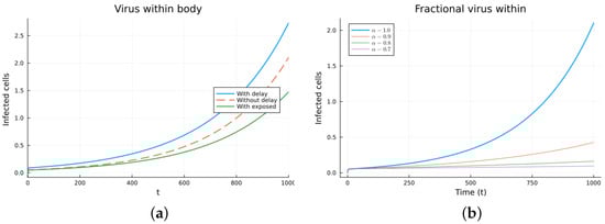Virus within-host models, infected cells, for . (a) ODE, DDE, and exposed population models. (b) Fractional models for several values of .