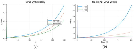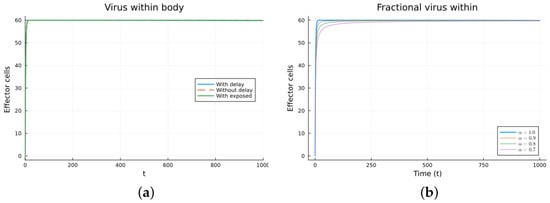Virus within-host models, effector cells. (a) ODE, DDE, and exposed population models. (b) Fractional models for several values of .