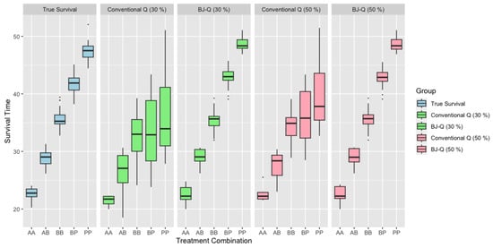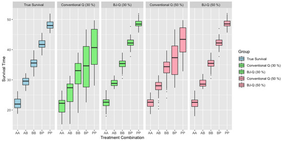 Table 1 and Table 2 offer an extensive comparative analysis of survival times across a spectrum of treatment groups, each delineated by distinct censoring scenarios, under and , respectively. The data for each group are organized systematically, with summary statistics calculated for various treatment codes: ‘AA’, ‘AB’, ‘BB’, ‘BP’, and ‘PP’. The summary statistics encompass several measures: The mean represents the arithmetic average of survival times, which sets a central point for the distribution within each treatment group. The standard deviation (SD) assesses the spread of survival times around the mean, reflecting the variability across the treatment groups. The median is the value separating the higher half from the lower half of the survival time data, serving as a resistant measure of central tendency that is less influenced by extreme values. The interquartile range (IQR) captures the spread of the central 50% of the data, providing insight into the data distribution’s variability. Finally, the first quartile (Q1) and third quartile (Q3) mark the 25th and 75th percentiles, respectively, offering further detail on the data distribution by identifying the range of the lower and upper quarters of the dataset.